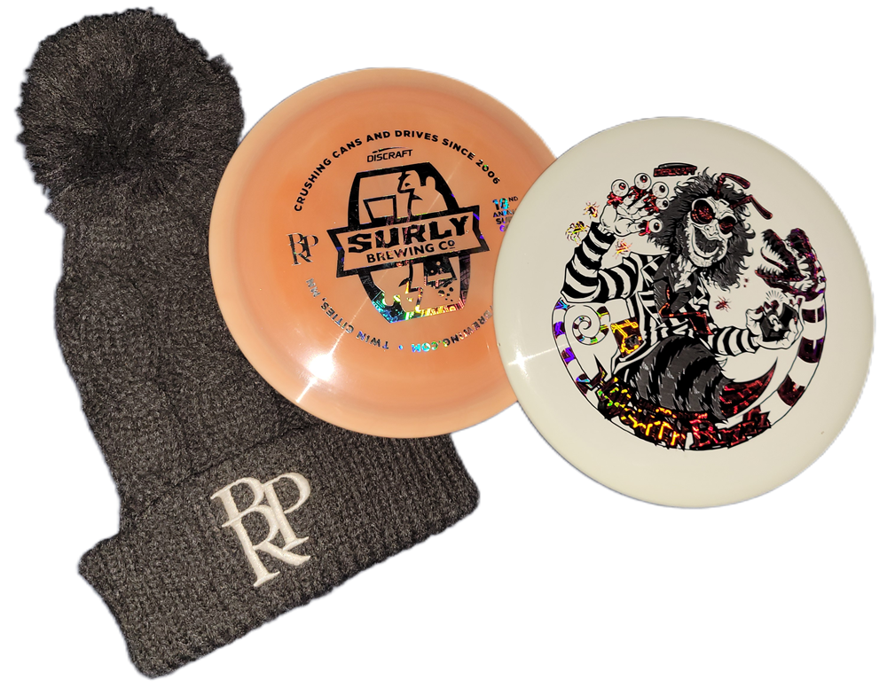 Package includes 2 discs, winter hat and four free rounds of disc golf. www.blueribbonpines.net **winner can pick up package at event or free delivery within the metro (outside of the metro we can make something work)**