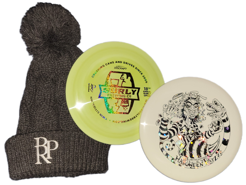Package includes 2 discs, winter hat and four free rounds of disc golf. www.blueribbonpines.net **winner can pick up package at event or free delivery within the metro (outside of the metro we can make something work)**