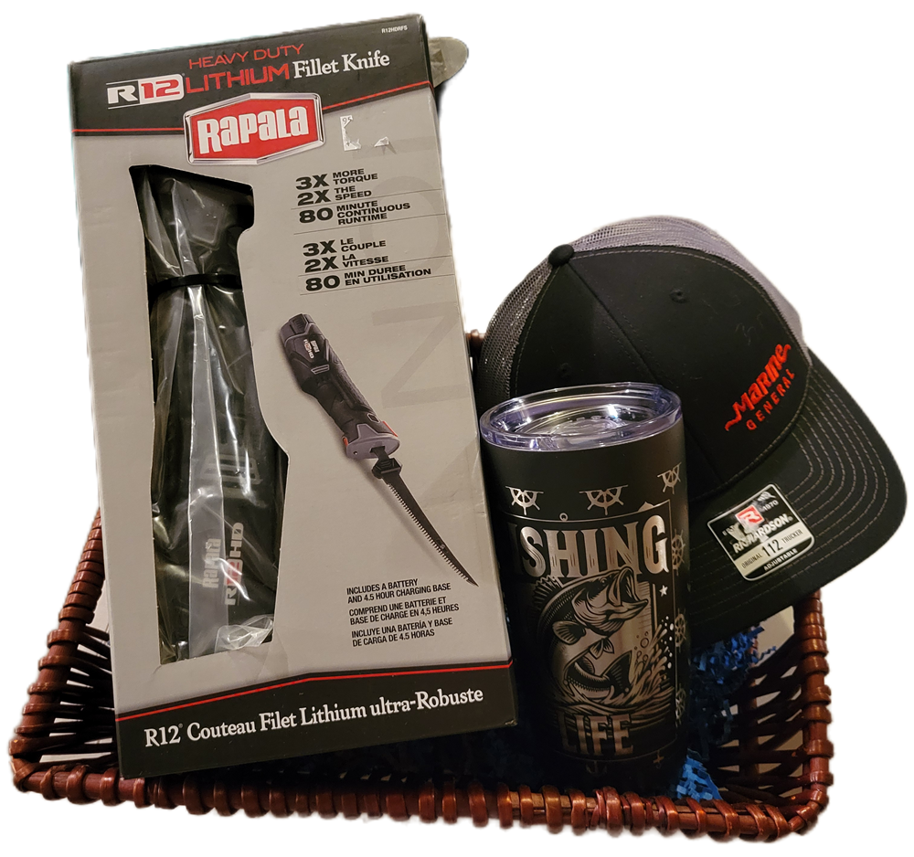Basket includes a Rapala Lithium Fillet knife and hat donated by Marine General in Duluth. Also includes a laser etched travel mug donated by Etched Laser Engraving. **winner can pick up basket at event or free delivery in the metro (outside of the metro we will figure it out!)**