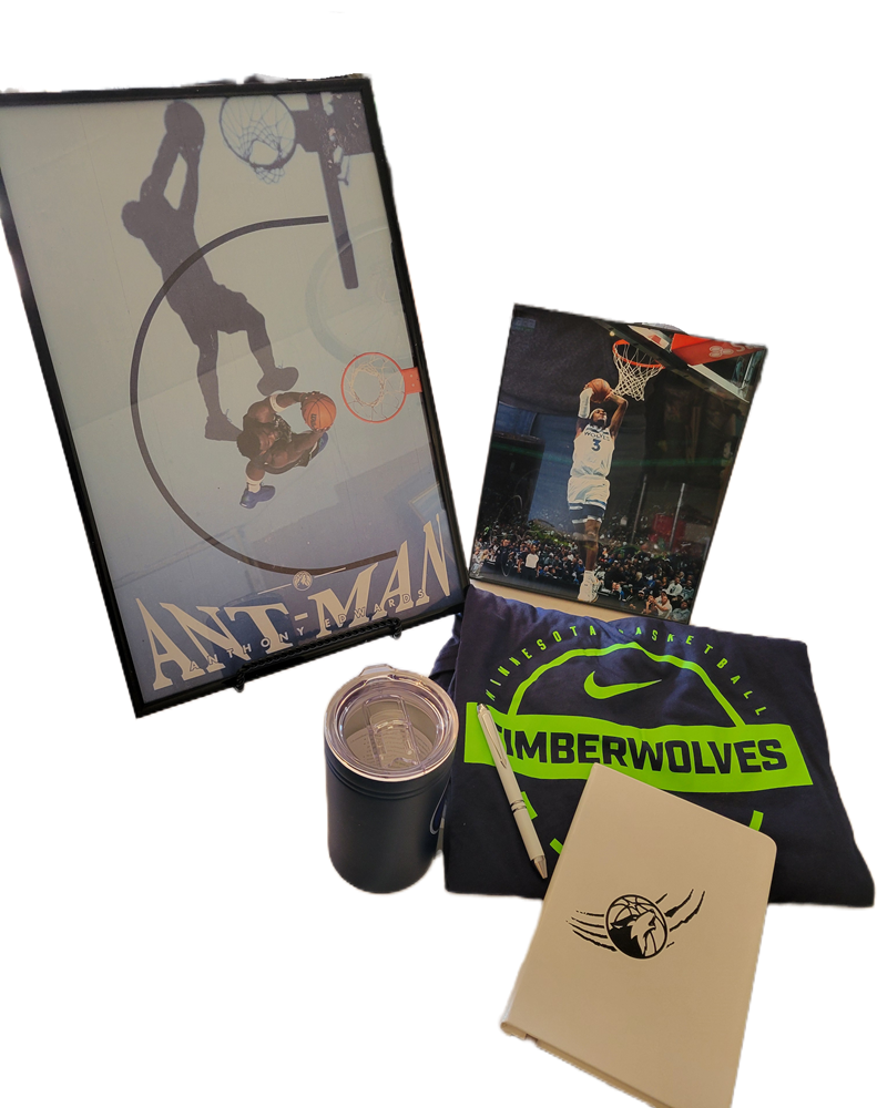 Autographed photo of Jaden McDaniels (8x10), Ant-Man Poster (11x17), Timberwolves Mug, Timberwolves Tshirt, and Timberwolves notebook and pen. **winner can pick up items at event or free delivery in the metro (outside of the metro we can make something work)**